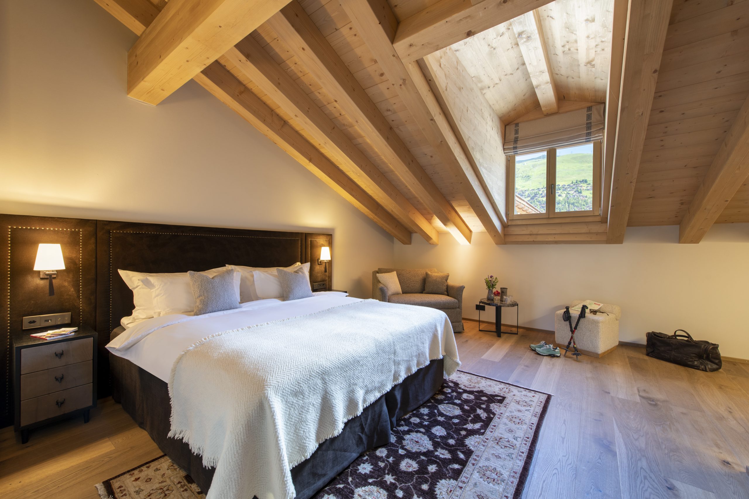 Ces chambres d’ambiance chaleureuse (23-24 m2) sous les combles sont équipées de lits doubles king-size ou, sur demande, de lits jumeaux. Ces chambres disposent d’une salle de bains sur mesure avec une belle douche à l’italienne ou une baignoire ainsi qu’une vue sur la montagne, des couleurs naturelles et une véritable sensation alpine.